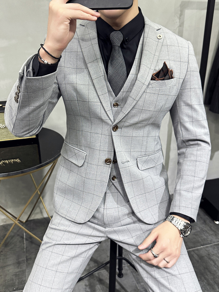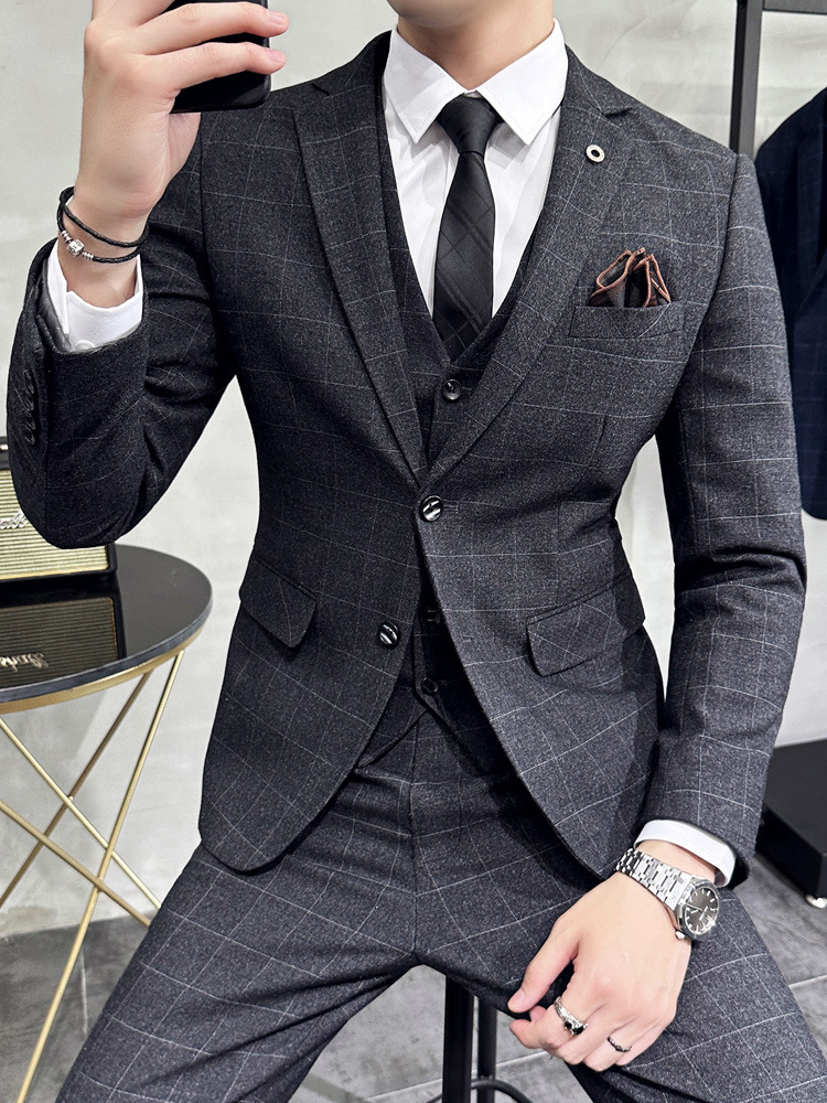 Men's three-piece casual formal slim wedding dress plaid suit men's British autumn
